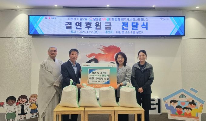 (포탈뉴스통신) 달성군가족센터(센터장 방승희)는 지난 22일 센터 내에서 대한불교조계종 용연사(주지 능도 스님)와 함께 ‘취약·위기 다문화가정 결연금 전달식’을 가졌다고 밝혔다. 이번 사업은 경제적 고통과 위기 상황에 놓인 관내 저소득 다문화 8가구를 돕기 위해 기획됐다.