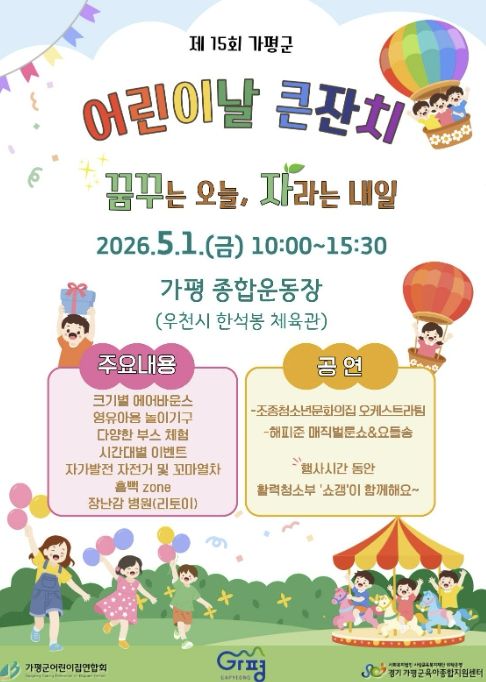 (포탈뉴스통신) 가평군은 오는 5월 1일 오전 10시 가평종합운동장에서 ‘제15회 가평군 어린이날 기념행사’를 개최한다. 가평군어린이집연합회와 가평군육아종합지원센터가 공동 주관하는 이번 축제는 기념행사와 공연, 놀이, 체험 부스 등 다채로운 프로그램으로 꾸며진다.