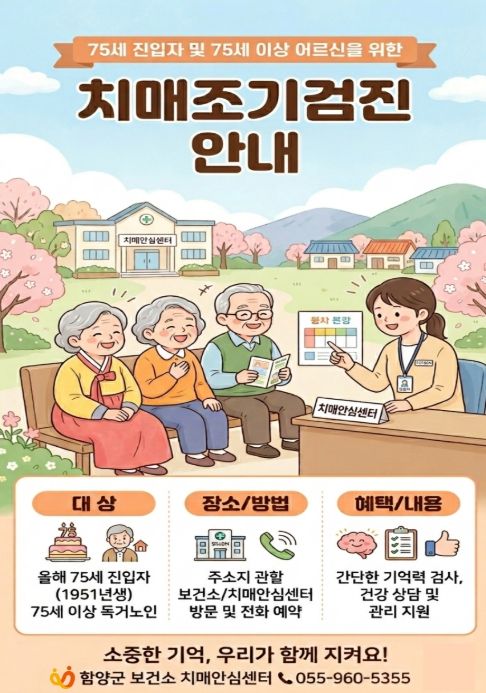 치매 조기 검진 관련 자세한 절차는 함양군 치매안심센터로 문의하면 안내받을 수 있다.