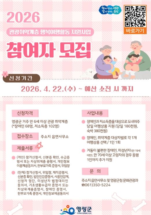 (포탈뉴스통신) 영광군은 지난 4월 22일부터 관광활동에서 소외되기 쉬운 관광취약계층의 기본권 보장을 위해‘2026년 관광 취약계층 행복여행활동 지원사업’참가자를 모집하고 있다고 밝혔다.