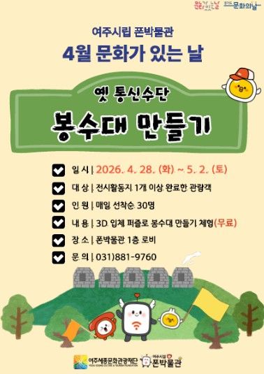 (포탈뉴스통신) 여주세종문화관광재단이 운영하는 여주시립 폰박물관은 4월 '문화가 있는 날'을 맞아 오는 4월 28일부터 5월 2일까지 시민 참여형 체험 행사 '소식을 전하던 봉수대 만들기'를 운영한다.
