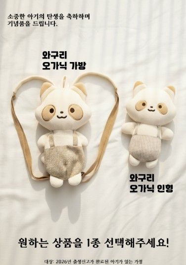 이번에 추가된 축하 기념품은 ‘와구리 백팩’으로, 기존에 지급하던 ‘와구리 애착인형’과 새롭게 추가된 ‘와구리 백팩’ 가운데 하나를 선택해 받을 수 있다. 유기농 애착 인형은 아이의 정서적 안정과 수면 습관 형성에 도움을 주어 정서적 교감을 중시하는 가정에 적합하며, 와구리 백팩은 기저귀와 손수건 등 간단한 유아용품을 수납할 수 있도록 제작돼 실용성을 중시하는 가정에 도움이 될 것으로 기대된다.