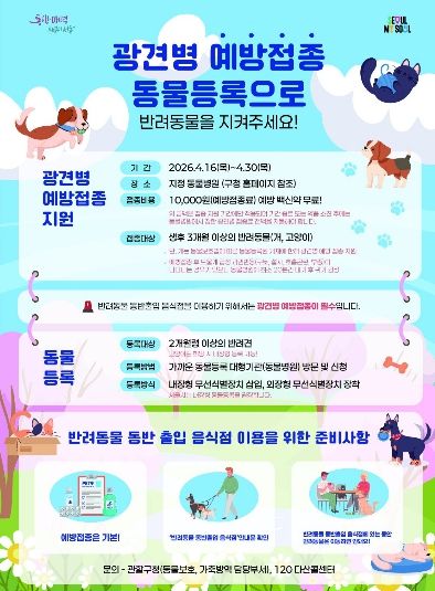 (포탈뉴스통신) 광진구는 반려동물의 건강 증진과 구민의 안전을 위해 ‘2026년 봄철 광견병 예방접종’ 지원을 4월 30일까지 시행한다.