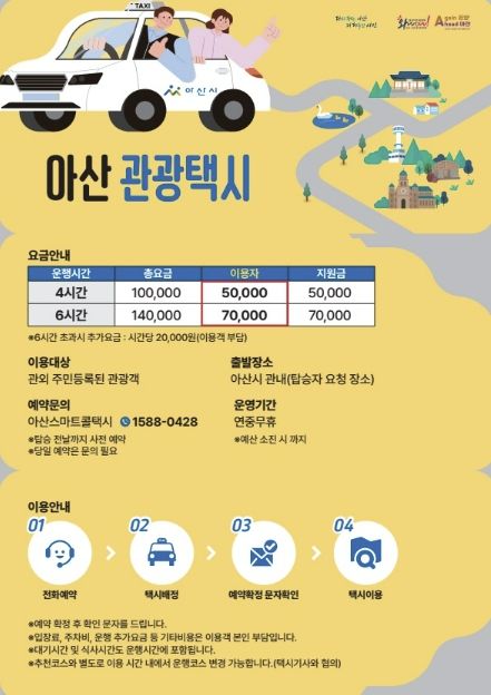 이용 대상은 아산을 방문하는 관외 관광객이며, 이용을 원하는 경우 여행 전날 ‘아산스마트콜택시’를 통해 사전 예약하면 된다. 이용 요금은 아산시에서 50%를 지원해 4시간 기준 5만 원, 6시간 기준 7만 원이다.