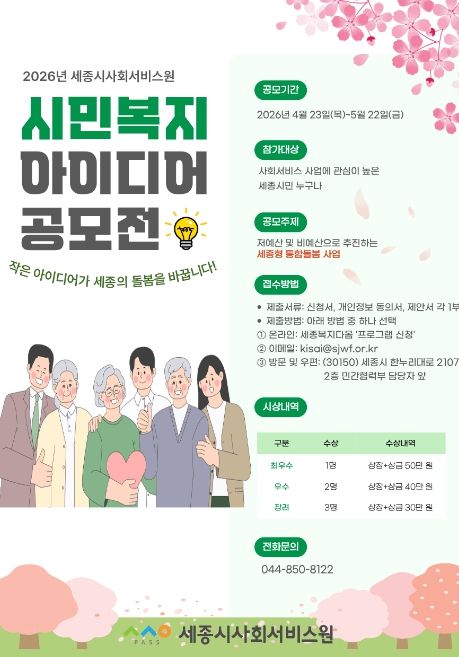 (포탈뉴스통신) 세종시사회서비스원은 시민의 일상 속 경험과 참신한 제안을 바탕으로 지역 복지 문제를 함께 해결하기 위해 ‘2026년 시민복지 아이디어 공모전’을 개최한다고 밝혔다.