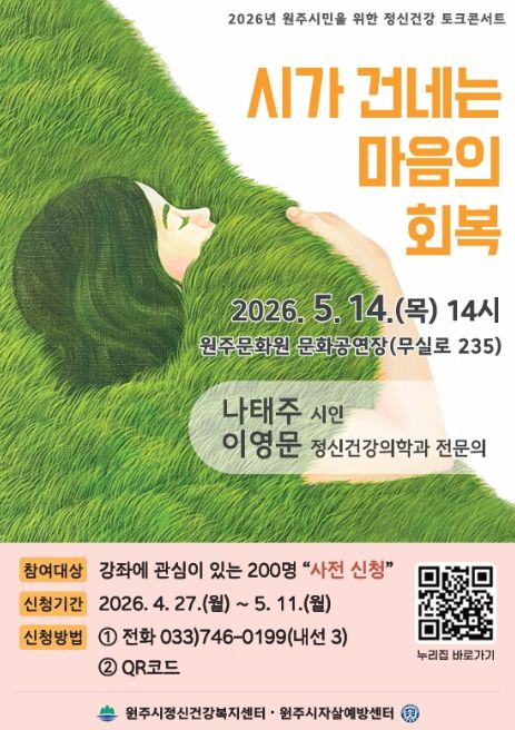 (포탈뉴스통신) 원주시정신건강복지센터는 다음 달 14일 원주문화원 문화공연장에서 ‘시가 건네는 마음의 회복’을 주제로 정신건강 토크콘서트를 개최한다.