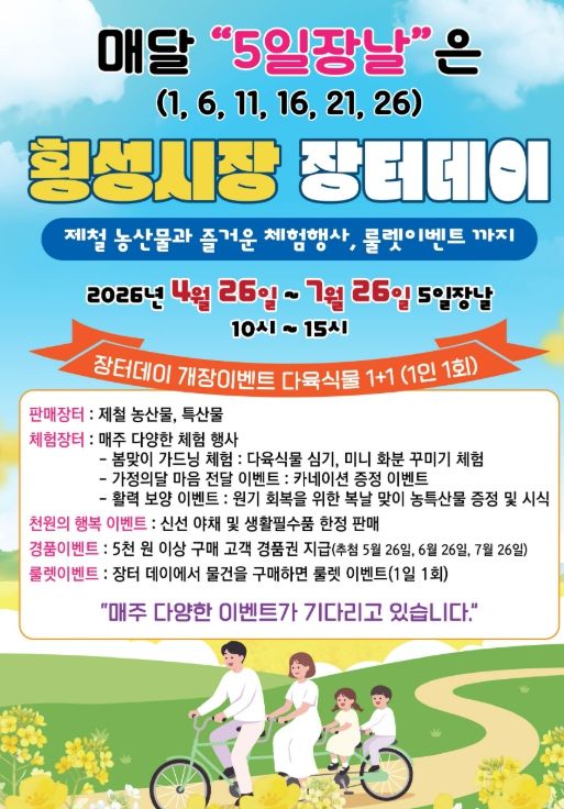 (포탈뉴스통신) 횡성군이 전통시장 내 고객 유입을 촉진하고 지역 경제에 활력을 불어넣기 위해 오는 4월 26일부터 7월 26일까지 ‘2026 횡성전통시장 장터데이’ 행사를 개최한다.