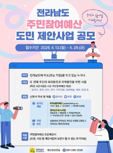 (포탈뉴스통신) 전라남도는 2027년 예산 편성을 위한 주민참여예산 제안사업 공모를 5월 29일까지 진행한다고 밝혔다.