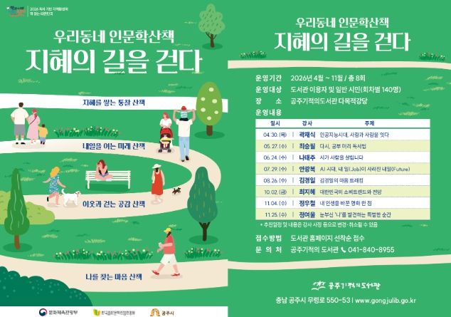 (포탈뉴스통신) 공주시는 시민의 인문학적 소양을 높이고 독서 문화를 확산하기 위해 ‘우리 동네 인문학 산책 : 지혜의 길을 걷다’ 프로그램을 본격 운영한다고 밝혔다.
