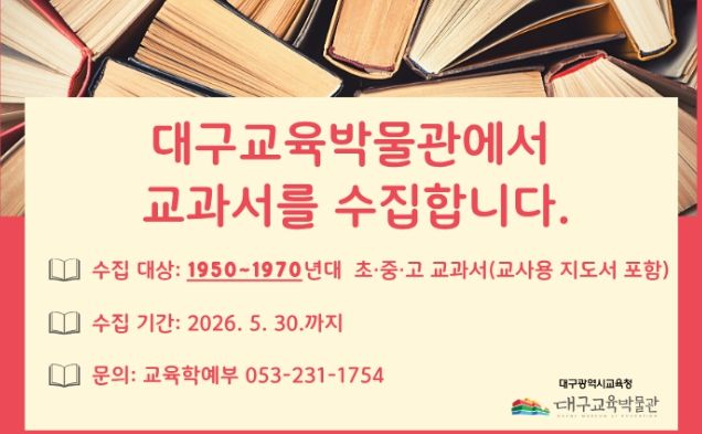 홍진근 관장은 “교과서는 당시 교육의 모습과 시대의 변화를 엿볼 수 있는 소중한 자료”라며, “많은 분들께서 함께 참여해 대구교육의 발자취를 담아주시면 감사하겠다”고 전했다.