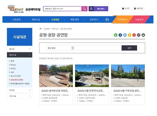 신청자는 김해시청 누리집 내 ‘공공예약포털’ 메뉴에서 ▶시설 대관 ▶공원‧광장‧공연장에 들어가서 사용하고자 하는 공원을 선택해 예약현황을 보고 예약 가능한 날짜와 시간을 선택하면 된다.