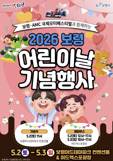 ‘즐거움이 팡팡! 웃음꽃이 팡팡! 행복한 도시 OK보령’이라는 슬로건 아래 열리는 이번 행사는 2026 보령·AMC 국제 모터 페스티벌과 연계해 진행되며, 행사장 내 어린이 체험공간에서 ▲바다유리 키링 ▲키캡 ▲액자 ▲향수 ▲비누 등 각종 만들기 체험과 이벤트 등에 참여할 수 있다.