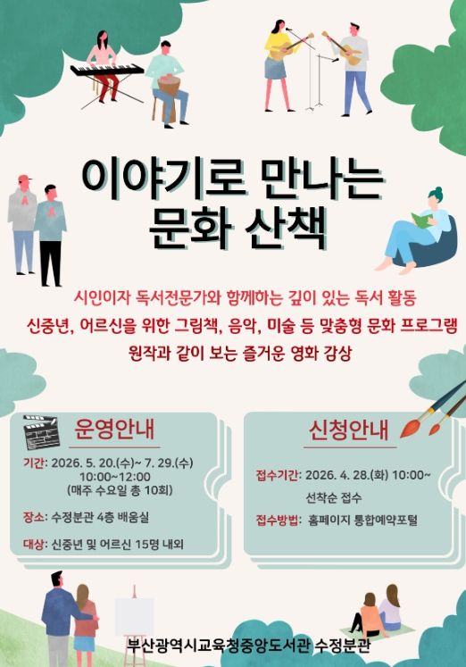 (포탈뉴스통신) 부산광역시립중앙도서관은 오는 5월 20일부터 7월 29일까지 매주 수요일마다 중앙도서관 수정분관에서 신중년 및 어르신 15명을 대상으로 ‘이야기로 만나는 문화 산책’ 프로그램을 운영한다.