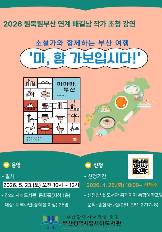 (포탈뉴스통신) 부산광역시립사하도서관은 다음달 23일 오전 10시 사하도서관 문화홀에서 청소년과 성인 25명을 대상으로 2026 원북원부산 연계 배길남 작가 초청 강연 ‘마, 함 가보입시다!’를 개최한다.