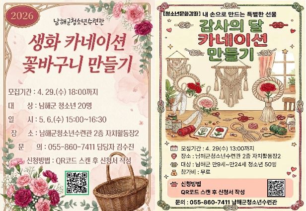 (포탈뉴스통신) 남해군 청소년수련관은 가정의 달 5월과 어버이날을 맞아 청소년 대상 문화체험 프로그램 ‘카네이션 만들기 원데이클래스’를 운영한다고 밝혔다.