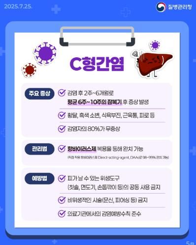 C형간염은 혈액·체액을 통해 전파되는 바이러스성 감염병으로, 방치하면 간경변증이나 간암으로 진행될 위험이 크다.