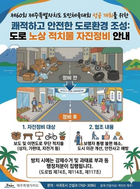 (포탈뉴스통신) 서귀포시는 2026년 개최되는 4개 주요 체전에 대비하여 방문객과 시민들에게 안전하고 쾌적한 도로 환경을 제공하기 위해 ‘노상적치물 집중 정비’를 본격 추진한다고 밝혔다.