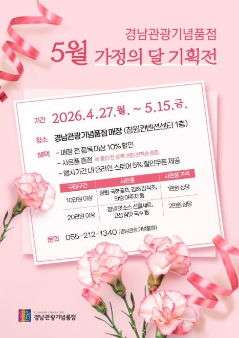 김상원 경남도 관광개발국장은 “가정의 달을 맞아 경남의 우수한 관광기념품이 소중한 분들께 전해지는 따뜻한 선물이 되길 바란다”며 “이번 기획전이 지역 경제 활성화와 관광산업 경쟁력 강화에 기여하는 계기가 되길 기대한다”고 밝혔다.