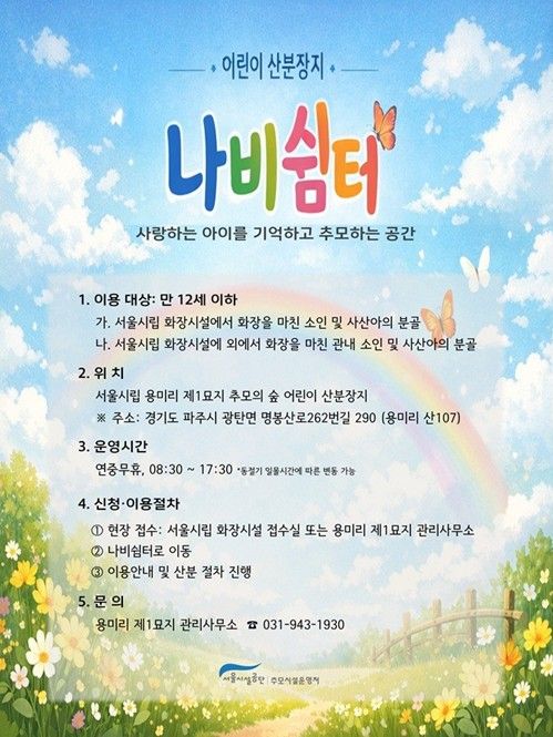 서울시는 5월 4일부터 용미리 제1묘지(경기도 파주시 소재) 추모의 숲 안에 약 500㎡ 규모 어린이 전용 산분장지 ‘나비쉼터’ 시범 운영에 들어간다고 밝혔다.