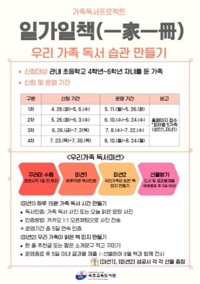 참여 가족에게는 선정도서와 독서대, 모래시계 등이 포함된 ‘일가일책 꾸러미’를 제공하며, 매일 15분 독서 인증과 독후활동(책 띠지 만들기) 미션을 수행하도록 지원한다.