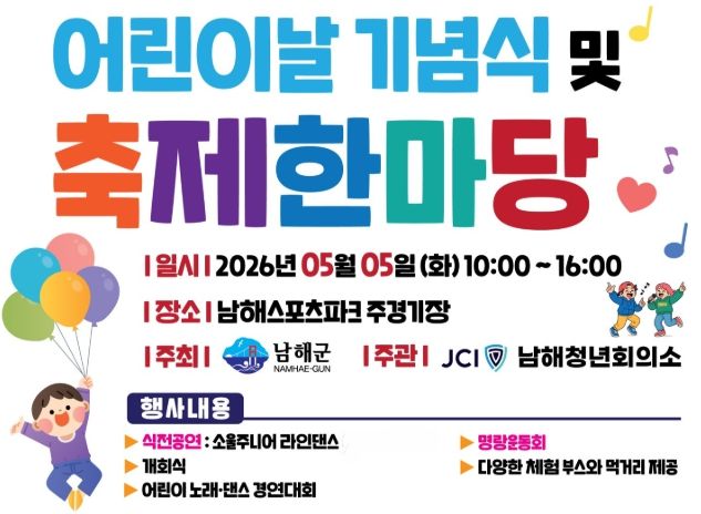 (포탈뉴스통신) 남해군은 5월 5일 어린이날을 맞아 ‘제104회 어린이날 기념식 및 축제한마당’을 남해스포츠파크 주경기장에서 개최한다.