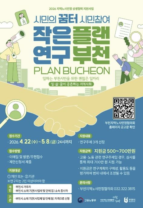 지원 대상은 부천시민 또는 부천시 소재 기관이며, 연구는 2인 이상이 참여해야 한다. 접수는 5월 8일까지 진행하며, 제안신청서를 작성해 전자우편, 방문 또는 우편으로 제출하면 된다.