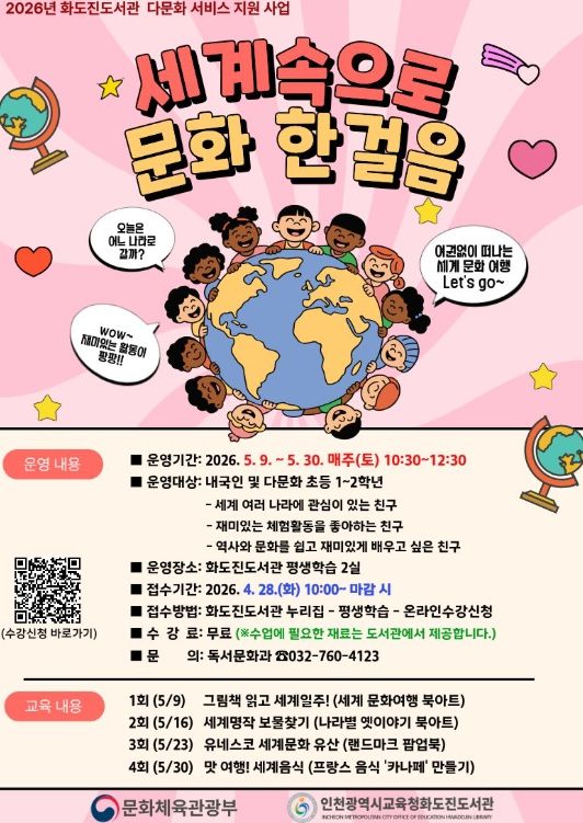 (포탈뉴스통신) 인천광역시교육청화도진도서관은 도서관 다문화 서비스 지원사업의 일환으로, 5월 9일부터 30일까지 매주 토요일 초등학생 대상 ‘세계속으로 문화 한걸음’프로그램을 운영한다.
