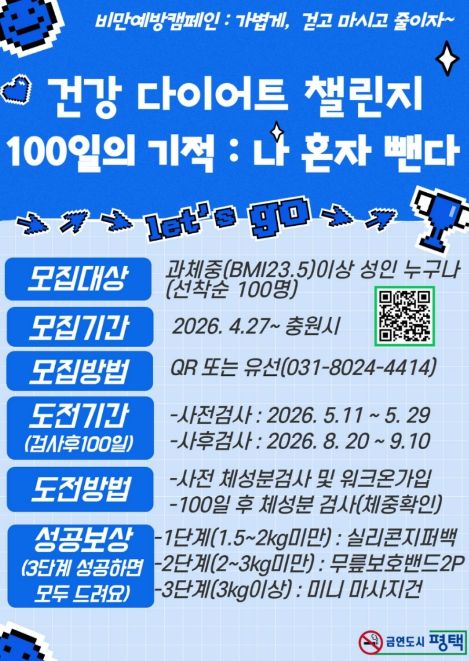 평택보건소 관계자는 “단순한 체중 감량을 넘어, 시민 스스로가 본인의 몸을 이해하고 관리하는 능력을 갖추는 것이 이번 프로그램의 핵심”이라며, “보건소와 함께하는 100일의 기적을 통해 많은 시민이 더 건강하고 활기찬 일상을 되찾길 바란다”라고 전했다.