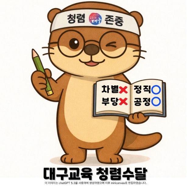 “대구교육 청렴수달”은 수질이 좋은 곳에서만 서식하는 천연기념물 330호 수달의 귀여운 이미지와 생태적 특성을 모티브로 대구시교육청 감사관실에서 생성형 인공지능(AI) 도구와 디자인 플랫폼을 활용해 제작했다.