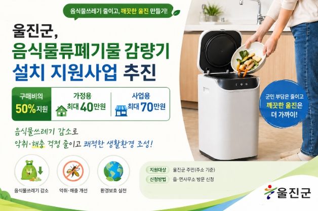 (포탈뉴스통신) 울진군은 음식물쓰레기의 발생량 감소와 군민 생활환경 개선을 위해 ‘음식물류폐기물 감량기 설치 지원사업(3차)’을 오는 5월 22일까지 선착순으로 모집한다.