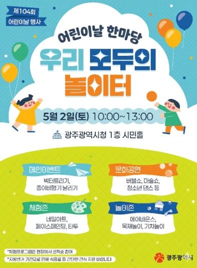 (포탈뉴스통신) 광주광역시는 어린이날을 기념해 오는 5월 2일 오전 10시부터 오후 1시까지 시청 1층 시민홀에서 특별행사를 연다.