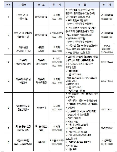 서울역사박물관 어린이박물관에서는 '한양에서 놀자!'(5.5.) 행사를 통해 공방·체험 프로그램 등이 진행되며, 경희궁에서는 독서 프로그램 '책 읽으라궁' (5.5., 5.10.)이 진행된다. 어린이 대상의 체험형 기획전시도 운영되고 있다.