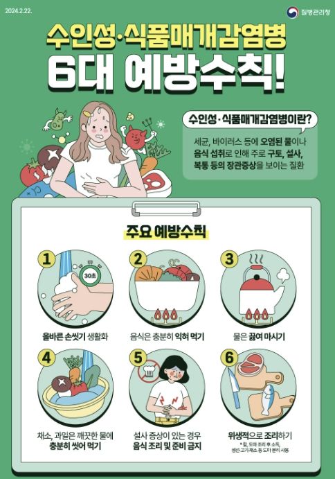보건소 관계자는 수인성·식품매개감염병 예방을 위한 6대 수칙으로 ▲흐르는 물에 30초 이상 비누로 손 씻기 ▲음식은 충분히 익혀 먹기 ▲물은 끓여 마시기 ▲채소·과일은 깨끗이 씻어 먹기 ▲설사 증상 시 음식 조리·준비 금지 ▲조리기구 구분 사용, 소독 등 위생적 조리를 실천해 줄 것을 당부했다.