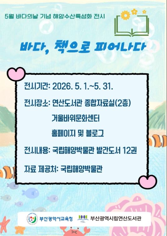 (포탈뉴스통신) 부산광역시립연산도서관은 바다의 날(5월 31일)을 기념해 5월 한 달간 지역주민과 도서관 이용자를 대상으로 해양·수산 특성화 전시 ‘바다, 책으로 피어나다’를 운영한다.