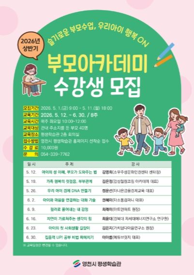 (포탈뉴스통신) 영천시 평생학습관은 5월 1일부터 11일까지 ‘2026년 상반기 부모아카데미’ 수강생을 모집한다.