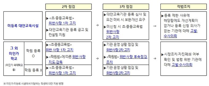 아울러, 교육부와 시도교육청은 이번 조치로 기관이 폐쇄되거나, 미인가·미등록 시설임을 인지하여 시설에서 이탈하는 학생·학부모에 대한 지원도 한층 더 강화한다.