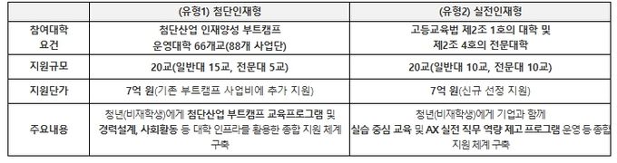지원 대상은 준비중 청년 등 19세 이상 34세 이하의 비재학생 청년이다. 이번 사업은 청년의 다양한 역량 수요와 진로 수요를 반영하여 ‘첨단인재형’과 ‘실전인재형’의 두 가지 유형으로 운영된다. 첨단인재형은 기존 첨단산업 인재양성 부트캠프 운영 기반을 활용하여 첨단분야 중심의 교육과 취업 지원을 제공하는 유형이며, 실전인재형은 인문·사회·예술·서비스 등 다양한 분야에서 기업과 함께 직무 중심의 인공지능 전환(AX, AI Transformation) 교육과정을 운영하는 유형이다.