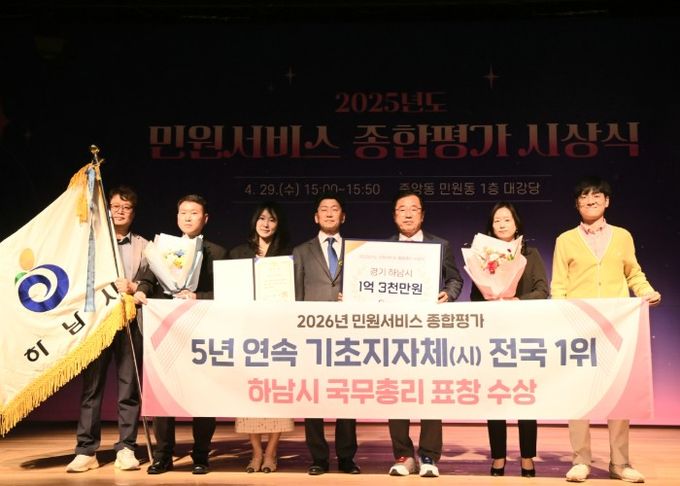 (포탈뉴스통신) 하남시가 전국 기초자치단체 중 최고 수준의 민원서비스 역량을 인정받으며 5년 연속 최우수 기관으로 선정됐다. 하남시는 29일 정부세종청사에서 열린 ‘2025년 민원서비스 종합평가’ 우수기관 시상식에서 국무총리 표창을 수상했다고 밝혔다.