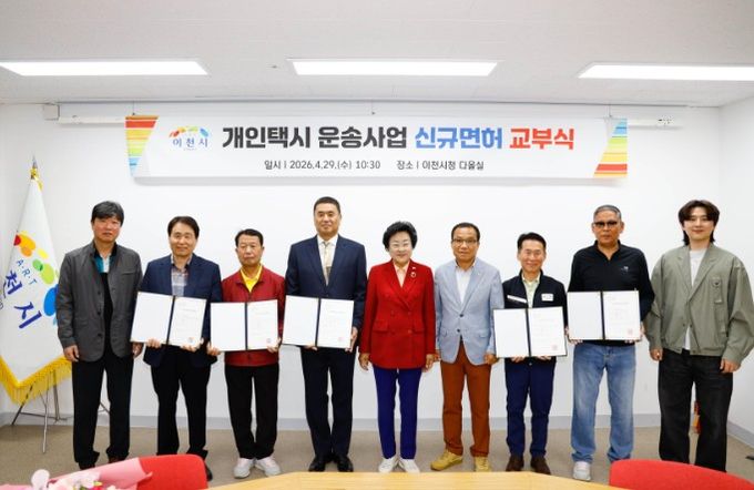 (포탈뉴스통신) 이천시는 29일 시청 다올실에서 개인택시운송사업 신규 면허증 교부식을 개최하고, 심사를 통해 최종 선정된 5명의 대상자에게 면허증을 전달했다고 밝혔다.