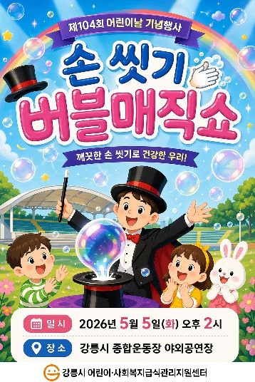 (포탈뉴스통신) 강릉시 어린이·사회복지급식관리지원센터는 제104회 어린이날을 맞아 오는 5월 5일, 강릉시가 주관하는 어린이날 기념 행사에 ‘올바른 손 씻기’를 주제로 한 버블매직쇼를 지원한다.