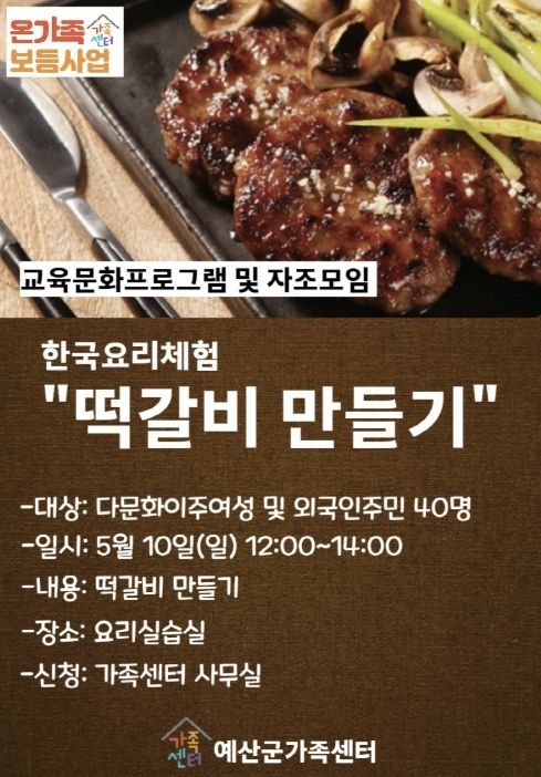 (포탈뉴스통신) 예산군가족센터는 지역 내 결혼이주여성과 외국인 주민의 한국문화 이해 증진과 안정적인 정착 지원을 위해 오는 5월 10일 한국전통요리 체험 ‘떡갈비 만들기’ 프로그램을 운영한다고 밝혔다.