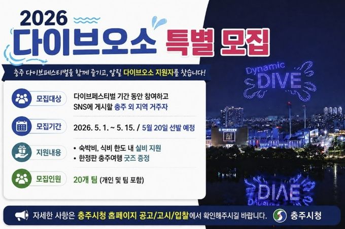 (포탈뉴스통신) 충주시가 ‘2026 충주 다이브 페스티벌 with MyK FESTA’을 맞아 지역 관광의 매력을 널리 알릴 특별 홍보단 ‘다이브 오소(O-SO) 충주’ 참여자를 모집한다고 밝혔다.