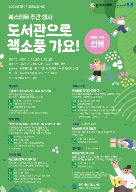 (포탈뉴스통신) 원주시립중앙도서관은 독서문화 확산을 위해 다음 달 16일부터 22일까지 2026 북스타트 주간 행사 ‘도서관으로 책소풍 가요!’를 운영한다.