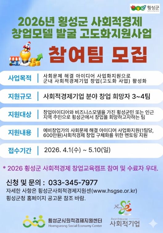 이영철 군 경제정책과장은 “이번 사업은 창업 지원을 넘어 지역의 문제를 해결하고 사회적 가치를 창출하는 모델을 만드는 데 중점을 두고 있다”며 “참신한 아이디어와 실행력을 갖춘 예비창업가들의 많은 참여를 바란다”고 전했다.