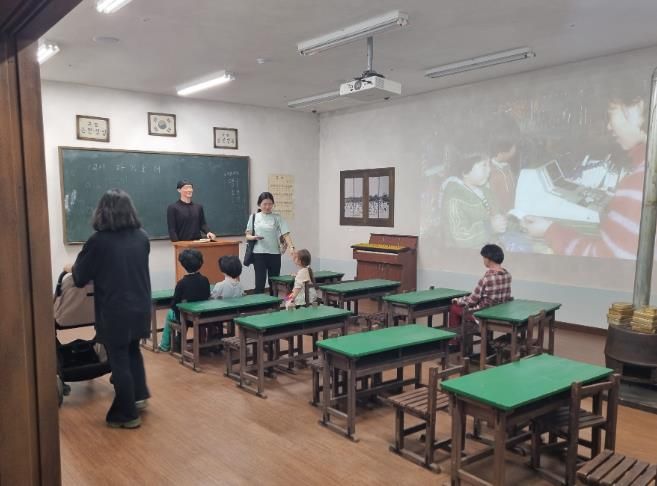 추억공작소 내부 전시실에는 옛 함평국민학교 교실을 재현해 교사와 학생들이 수업을 진행하는 모습을 연출했다.