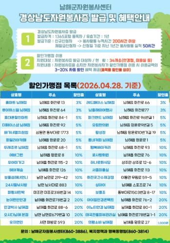 이로써 남해군 내 자원봉사자 할인가맹점은 기존 가맹점을 포함해 총 34개소로 확대됐다.