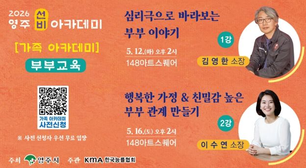 (포탈뉴스통신) 영주시는 건강한 가족문화 형성과 부부 간 소통 증진을 위해 ‘가족 아카데미 - 부부교육’ 참가자를 4월 30일부터 선착순 모집한다.
