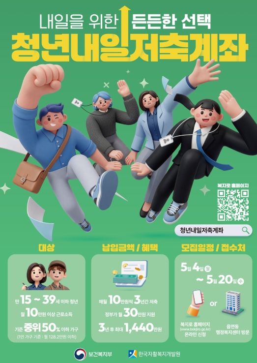 청년내일저축계좌는 근로 활동을 하는 저소득 청년이 매월 10만원 이상을 저축하면 매월 30만원의 정부 지원금을 추가로 제공해 안정적인 자산 형성을 돕는 사업이다.