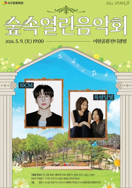 (포탈뉴스통신) 서구문화회관은 5월 9일 오후 7시 이현공원 잔디광장에서 싱어송라이터 10CM(십센치)와 포크 듀오 옥상달빛을 초청하여‘숲속열린음악회 with 이현공원’을 개최한다.