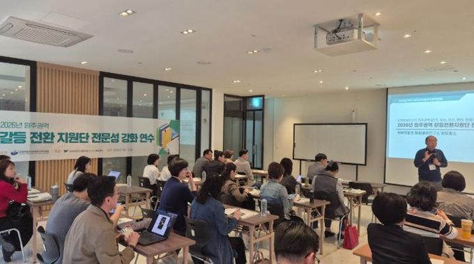 (포탈뉴스통신) 강원특별자치도원주교육지원청 학생지원센터는 4월 30일 원주시티호텔에서 원주권역(원주, 횡성, 영월, 정선, 평창) 갈등 전환 지원단 및 업무 담당자를 대상으로 ‘2026년 원주권역 갈등 전환 지원단 전문성 강화 연수’를 개최했다.
